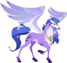 Cute Amaru is a small, furry dog-like cat creature with purple and white fur with dark blue hair, green eyes, a green and gold gem jewelry in his neck level, and a little fuzzy tail. He uses his green gem to transform into his Pegasus form, which resembles a purple and white furry horse with a blue mane, a small nose, a blue tail put in a ponytail on his rear and translucent periwinkle wings.