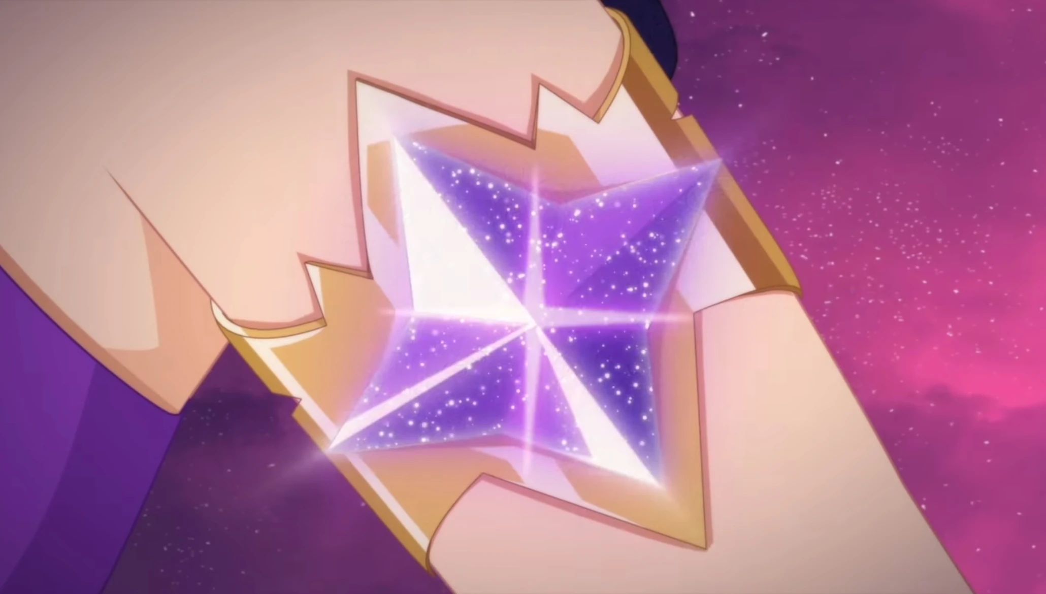 It has a purple star in the center and golden outlines around it. It is glittery all times. When Carissa transforms it became attached to the puffed sleeves of her dress.
