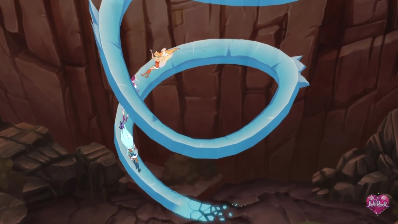 The episode starts off with Iris, Talia, and Auriana running away from Mephisto and Praxina's attacks. When running away from the twin's oncoming attacks, Talia quickly uses Crystal Slucium to land onto the ground safely. The twins, noticing that the princesses' were getting away, proceed to use their magic to launch more attacks on them: Even though both Iris and Talia used magic to try and get them away, both successfully had dodged them.